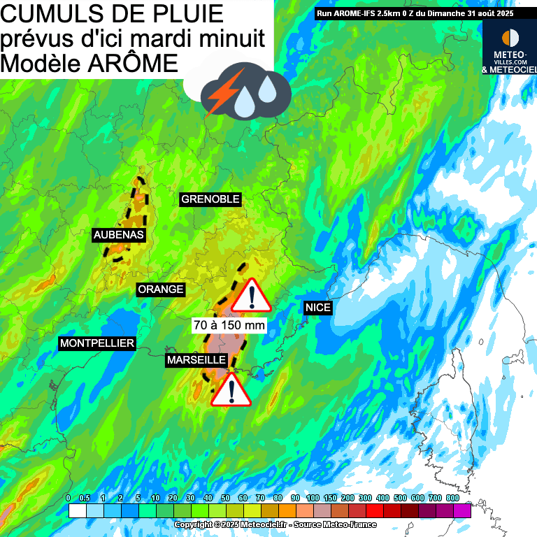Selon le modèle météo ARÔME, les cumuls de pluie pourraient dépasser 100 mm. Marseille se trouverait en limite, mais tout cela peut encore évoluer car il s'agit de pluie à caractère tropical avec beaucoup d'énergie et une prévisibilité assez limitée. Il suffit qu'une zone se déplace de quelques kilomètres pour faire toute la différence… Marseille serait donc touchée, mais il y a encore de grandes incertitudes.
