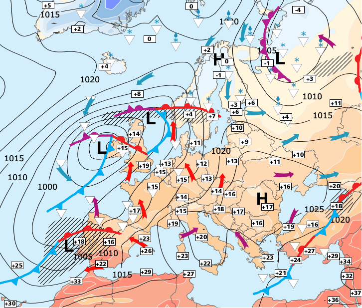 + Le gradient de pression se resserre entre l'anticyclone centré sur le Nord de l’Italie et la dépression Jadranka (Barbara pour les français).