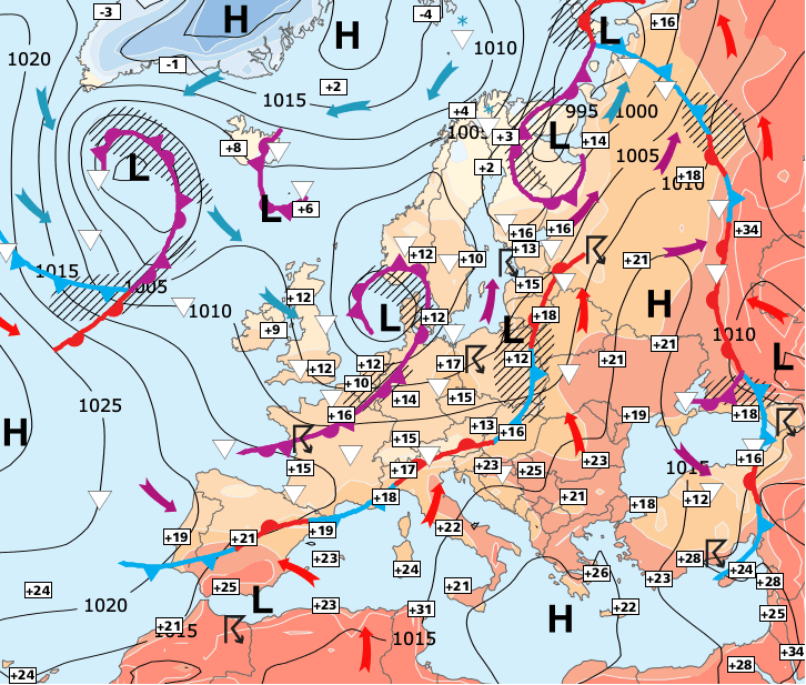 Noms des dépressions et anticyclones prévus pour dimanche 23 mai 2021 à midi (Berlin)