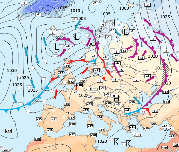+ Mercredi, une perturbation tentera d’envahir la Bretagne, mais elle sera rapidement refoulée par les hautes pressions qui se reconstitueront sur les îles britanniques.
