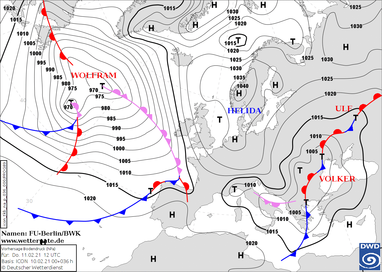 Noms des dépressions et anticyclones prévus pour jeudi 11 février 2021 à midi (Berlin)