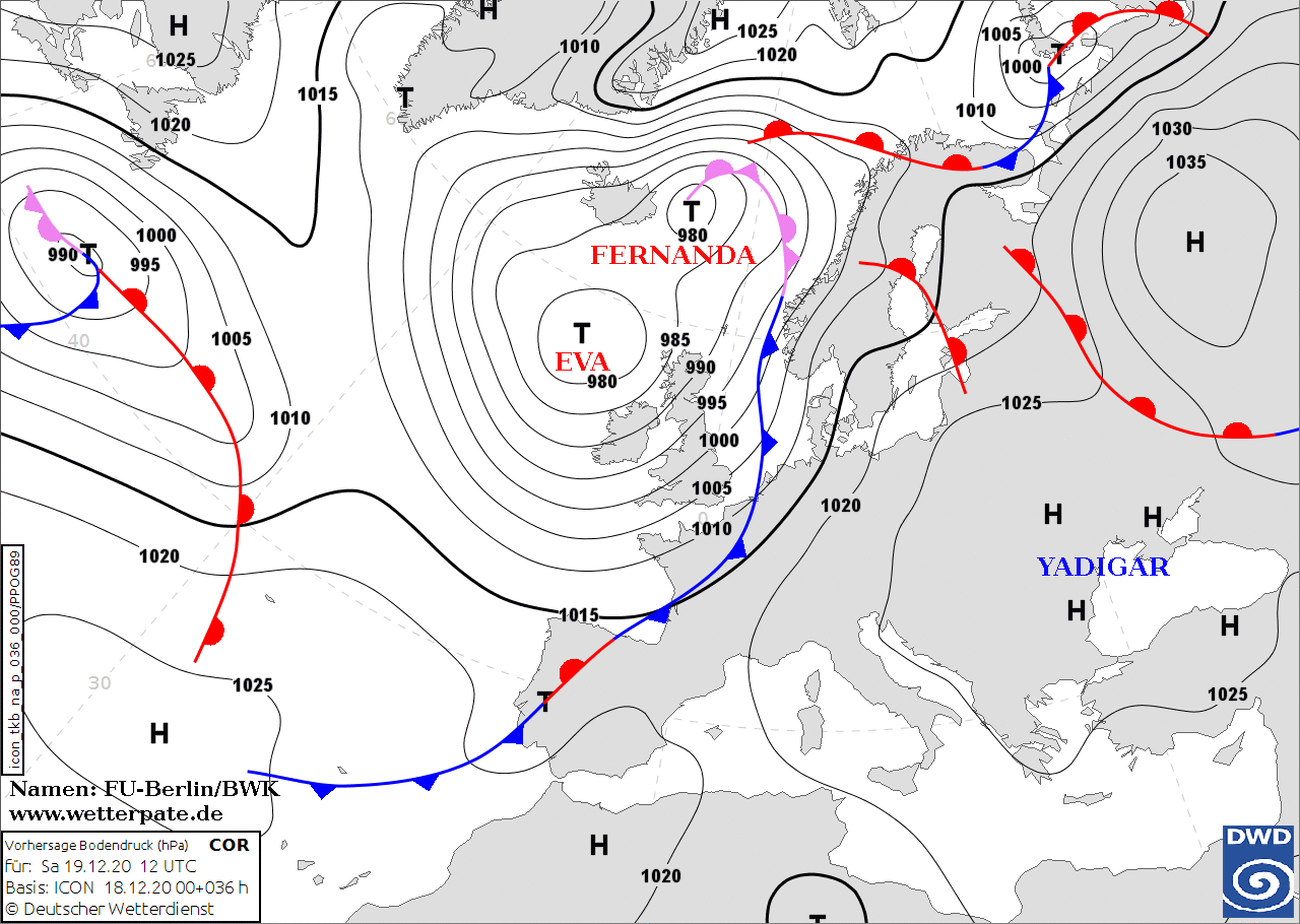 Noms des dépressions et anticyclones prévus pour samedi 19 décembre 2020 à midi (Berlin)