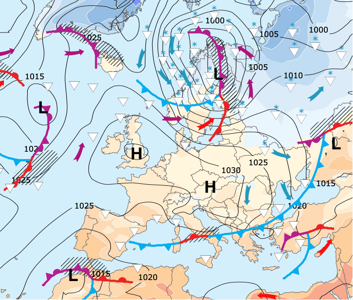 Noms des dépressions et anticyclones prévus pour dimanche 7 mars 2021 à midi (Berlin)