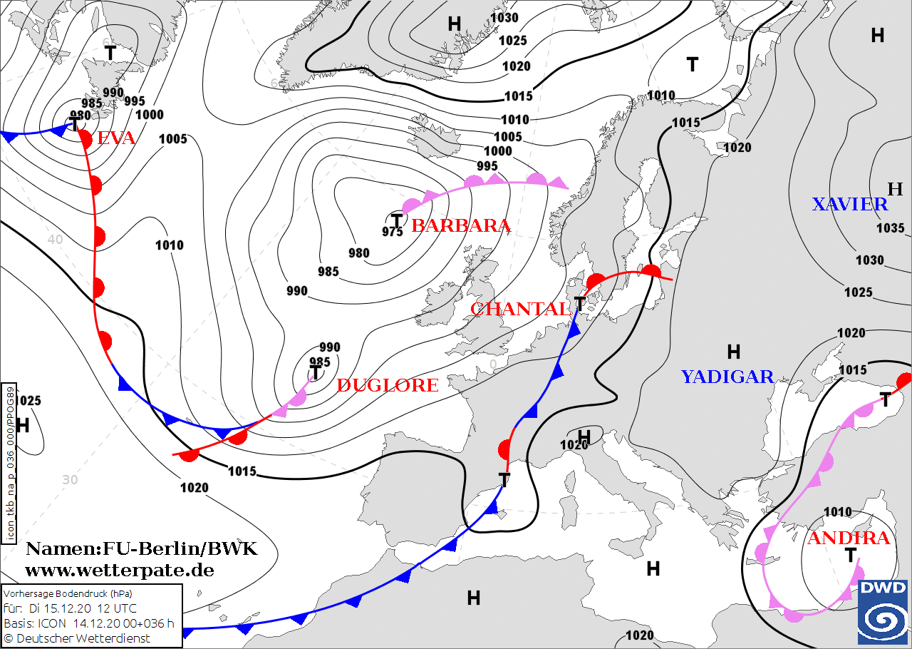 Noms des dépressions et anticyclones prévus pour mardi 15 décembre 2020 à midi (Berlin)