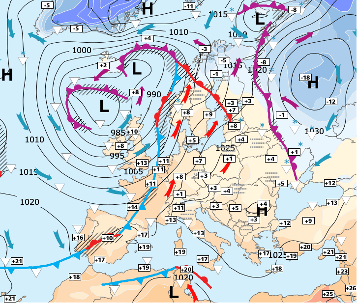 + À partir de dimanche 27 décembre, une vaste zone dépressionnaire accompagnée d’air plus ou moins froid (à préciser) englobera presque toute l’Europe occidentale et occasionnera de fréquentes précipitations (parfois sous forme de neige en montagne).