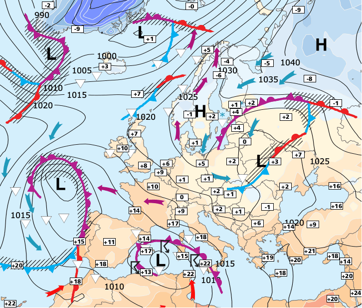 + L’anticyclone qui recouvre une bonne partie de l’Europe continentale dirigera de l’air de plus en plus froid et sec sur les régions du Nord et de l'Est avec des gelées matinales de plus en plus fréquentes entre dimanche et lundi.