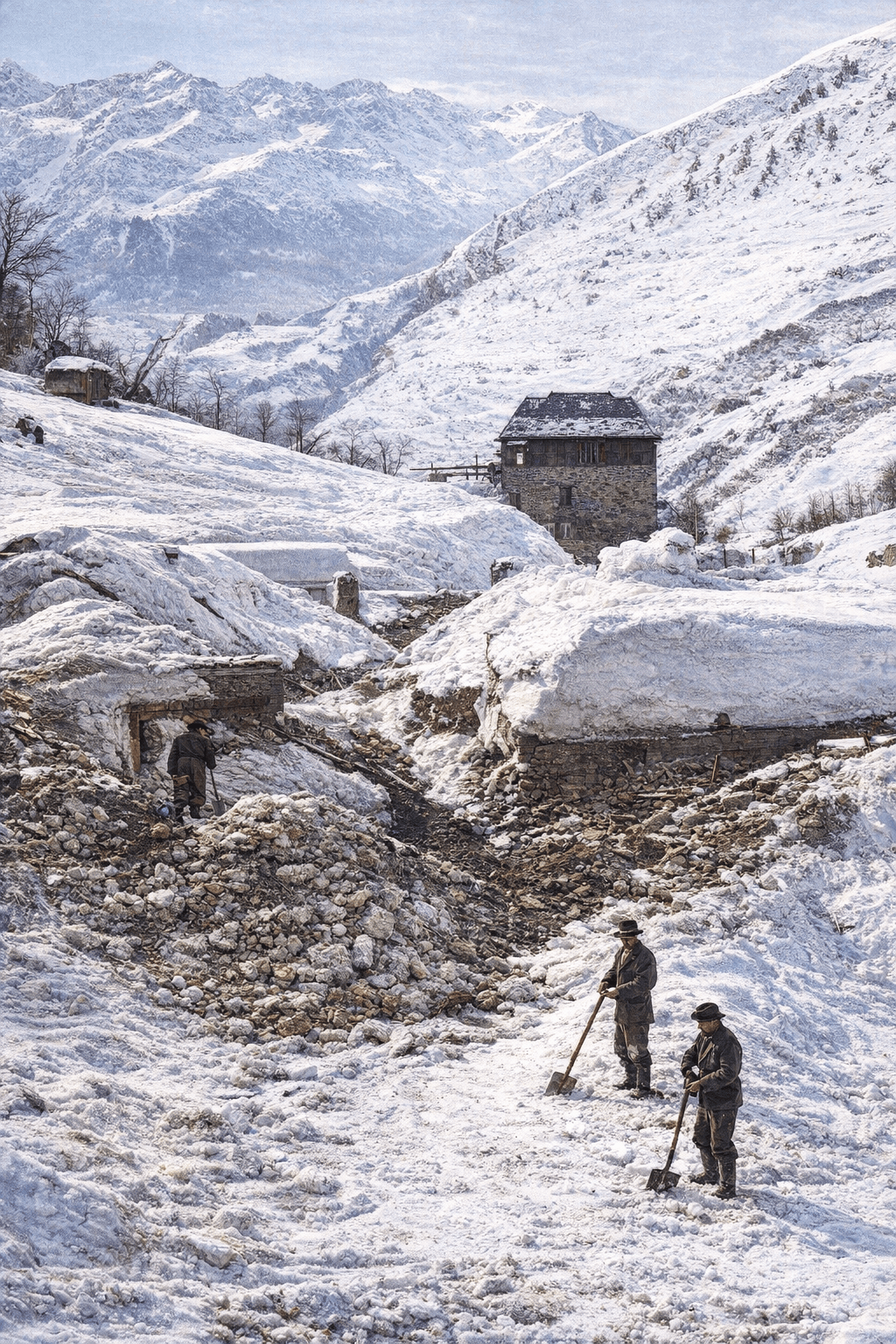 Avalanche à Barèges (Pyrénées) en février 1907 - Le déblaiement des maisons enfouies sous les masses de neige descendues du mont Capet