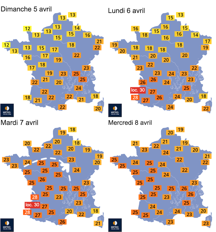 C'est confirmé ! La chaleur va débarquer au cours de ce week-end prolongé de Pâques, notamment pour la journée du lundi 6 avril 2026 dans le sud-ouest de la France où le thermomètre dépassera allègrement les 25°C ! On prévoit 28°C à Bordeaux et Biarritz avec des pointes probables à 30°C dans certaines localités d'Aquitaine, comme dans les Landes. Sur le nord et l'est, la journée la plus douce devrait être celle du mardi 7 avril avec des maximales souvent comprises entre 22 et 24°C (localement 25°C).